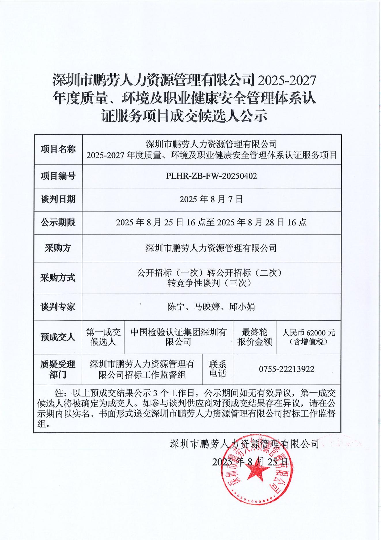 深圳市鹏劳人力资源管理有限公司2025-2027年度质量、环境及职业健康安全管理体系认证服务项目成交候选人公示