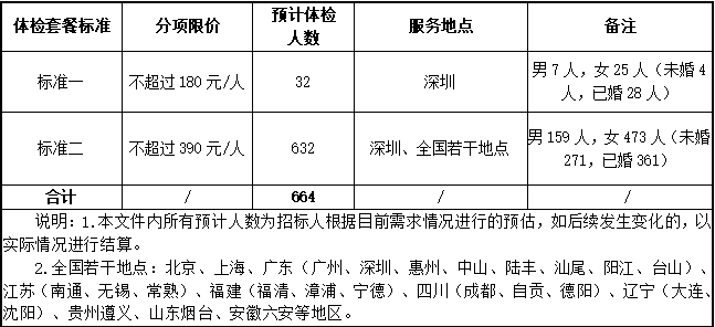 1.投标人应当根据招标人外派员工性别、年龄,分项限价设计适宜于招标人外派员工体检套餐并提供体检服务,出具体检结果与报告,提供健康管理建议;
