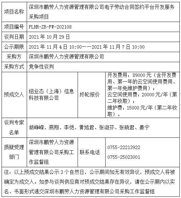 深圳市鹏劳人力资源管理有限公司电子劳动合同签约平台开发服务采购竞争性谈判结果公示