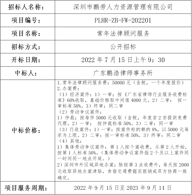 深圳市鹏劳人力资源管理有限公司常年法律顾问服务项目公开招标定标结果公示