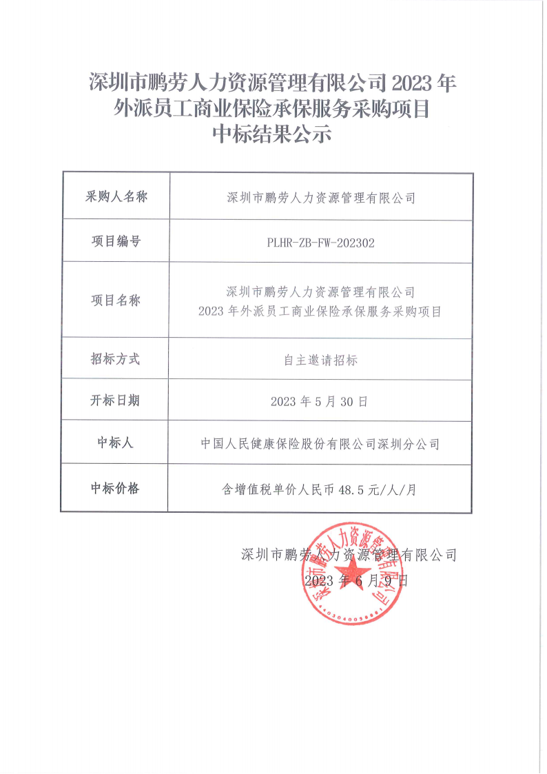 深圳市鹏劳人力资源管理有限公司2023年外派员工商业保险承保服务采购项目中标结果公示