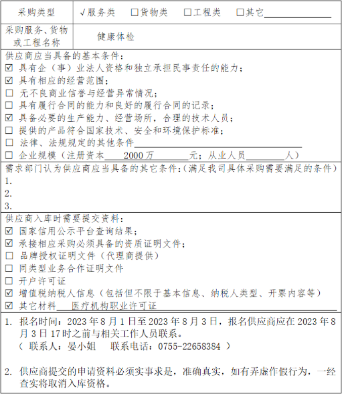 为了满足我司日益增长的采购需求,提高采购工作效率与质量,现面向社会公开征集新增供应商,参与我公司相关项目采购活动,欢迎符合条件的商家申请入库,现将有关事项公告如下: