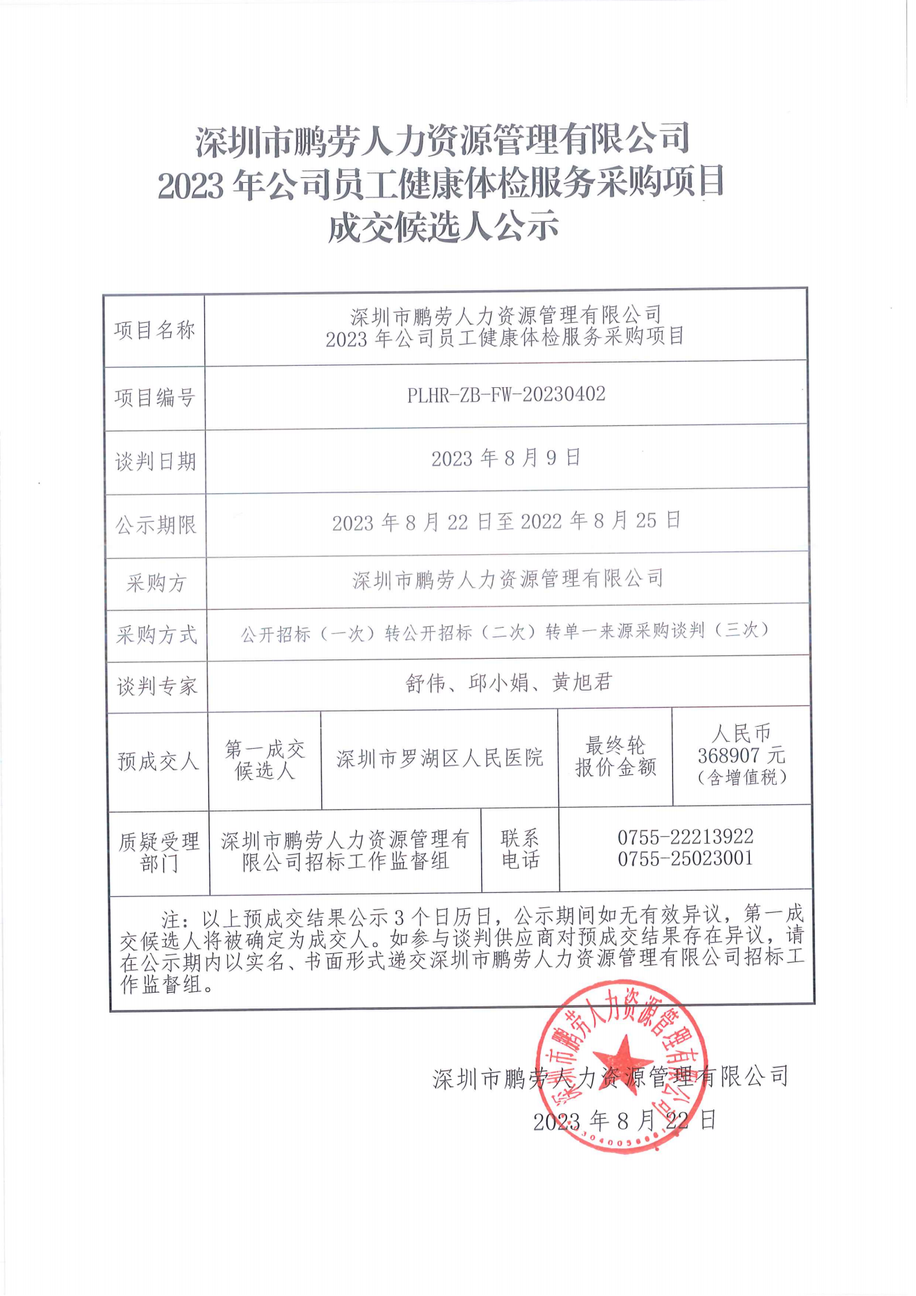 深圳市鹏劳人力资源管理有限公司2023年度员工健康体检服务采购项目成交候选人公示