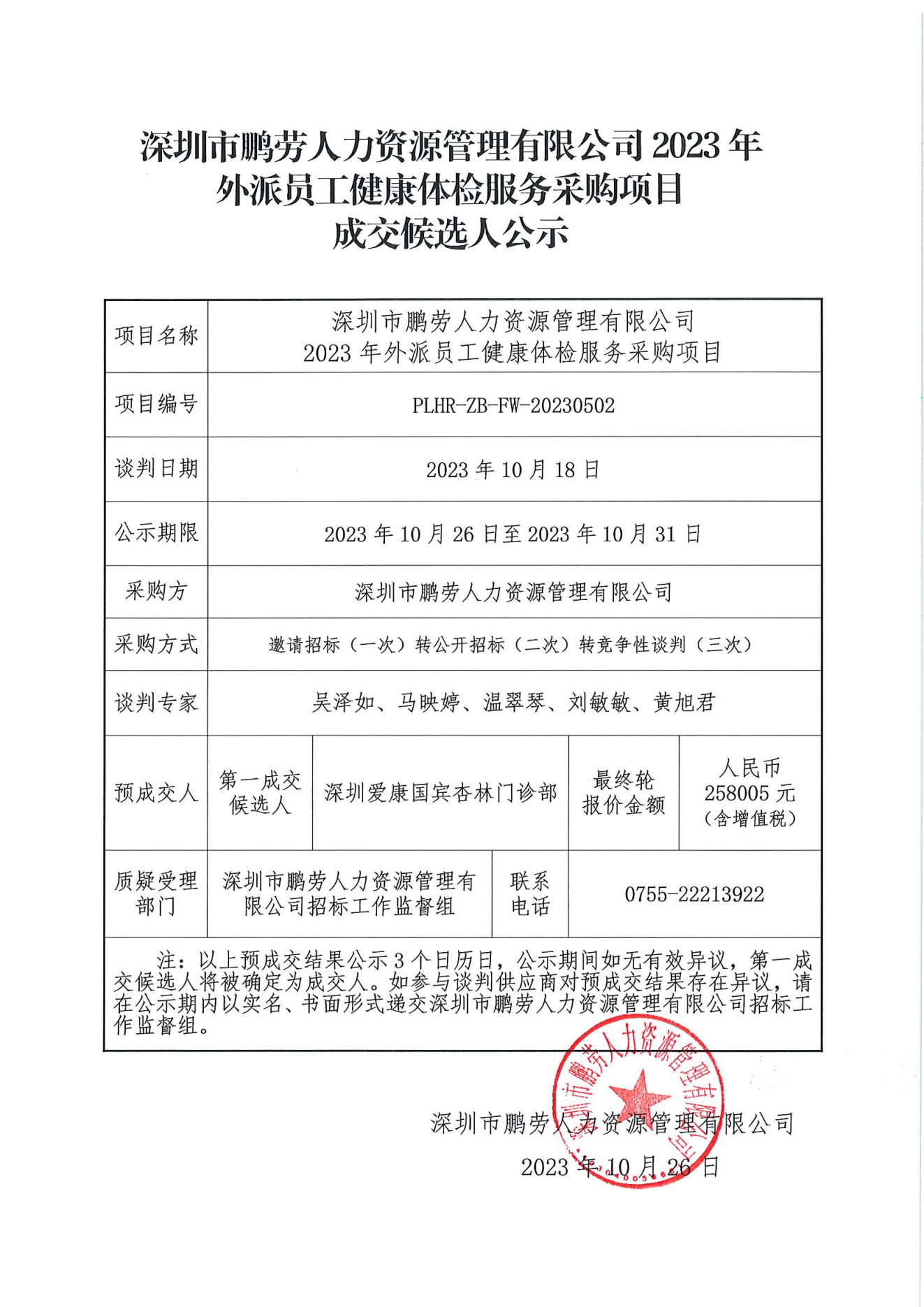 深圳市鹏劳人力资源管理有限公司2023年度外派员工健康体检服务采购项目成交候选人公示