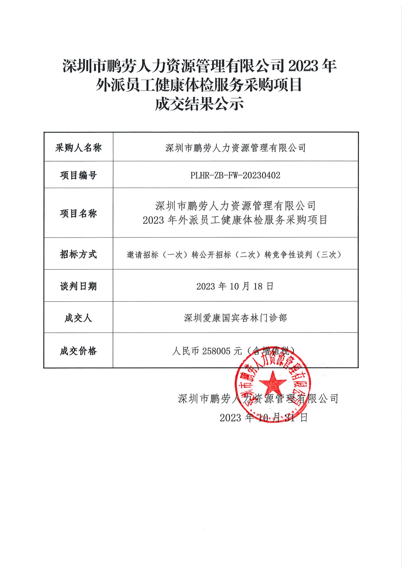 深圳市鹏劳人力资源管理有限公司2023年度外派员工健康体检服务采购项目成交结果公示