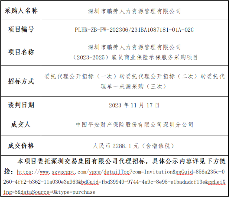 深圳市鹏劳人力资源管理有限公司(2023-2025)雇员商业保险承保服务采购项目成交结果公示