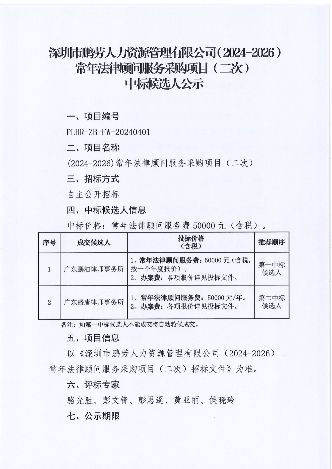 深圳市鹏劳人力资源管理有限公司(2024-2026)常年法律顾问服务采购项目(二次)中标候选人公示