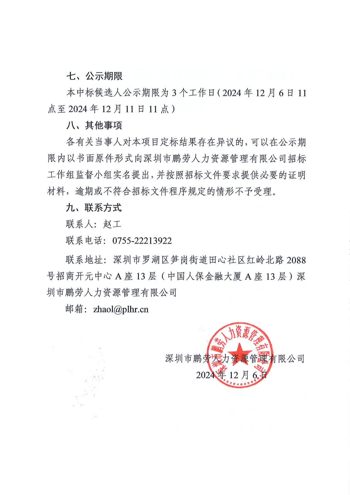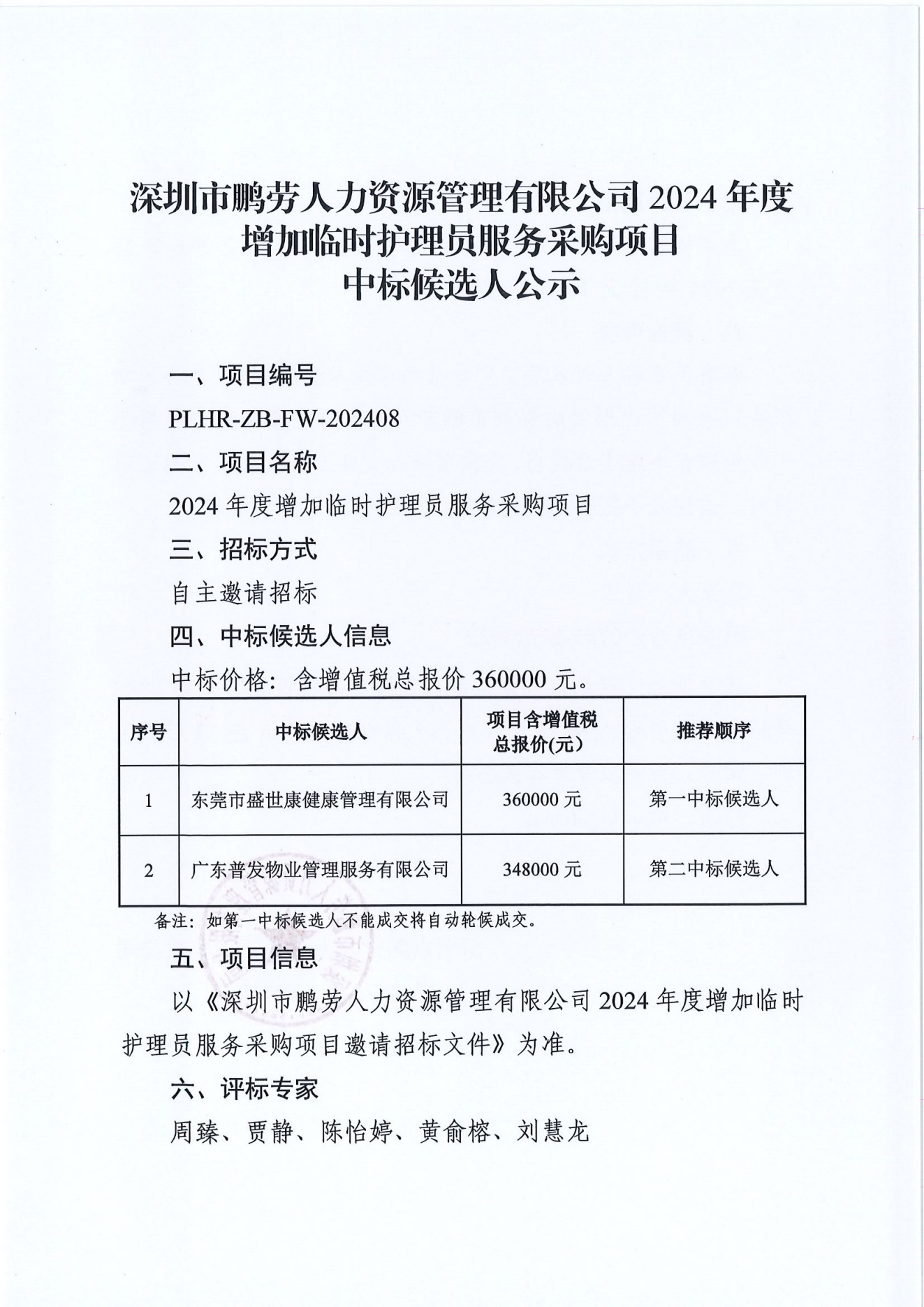 深圳市鹏劳人力资源管理有限公司2024年度增加临时护理员服务采购项目中标候选人公示