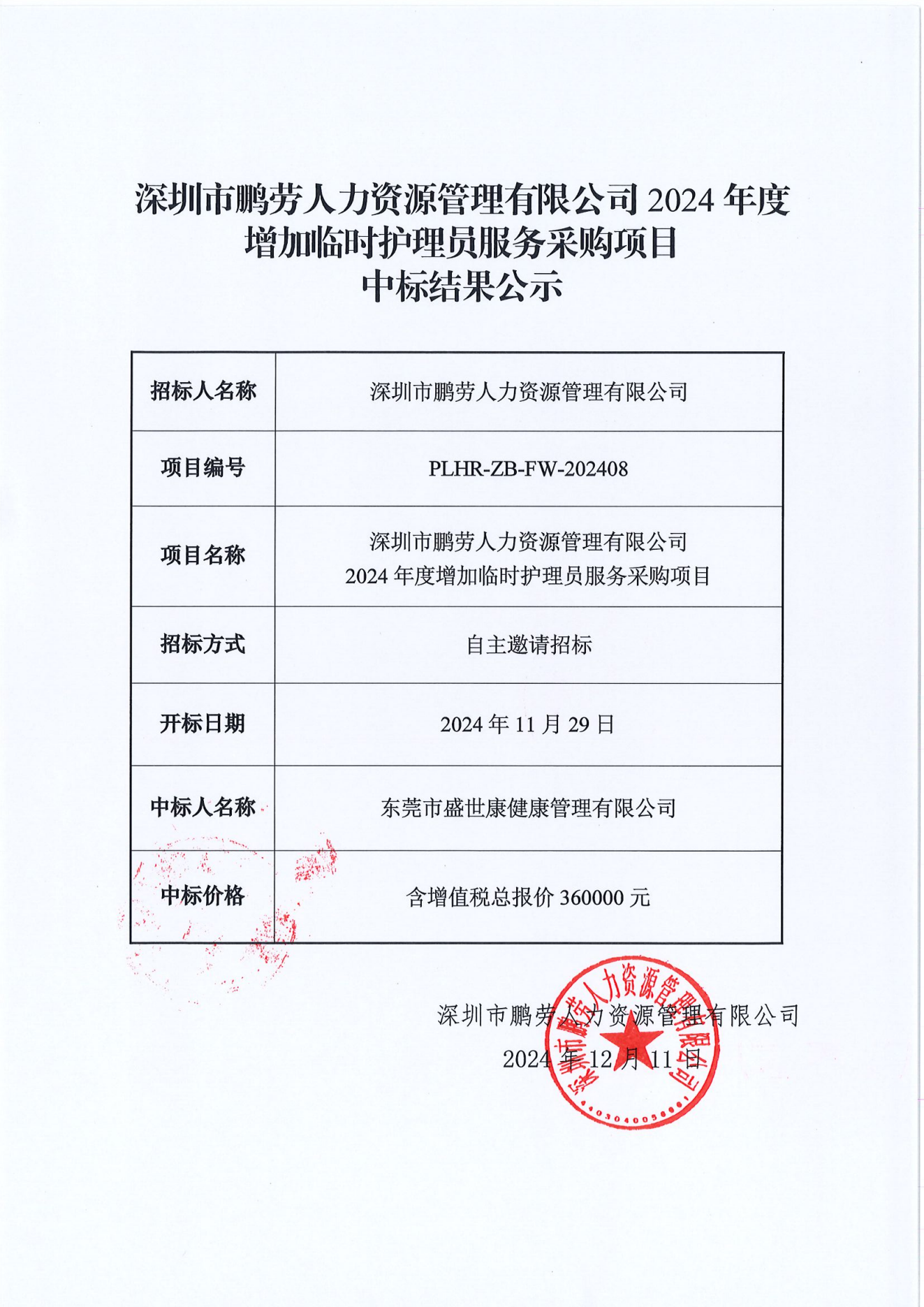 深圳市鹏劳人力资源管理有限公司2024年度增加临时护理员服务采购项目中标结果公示