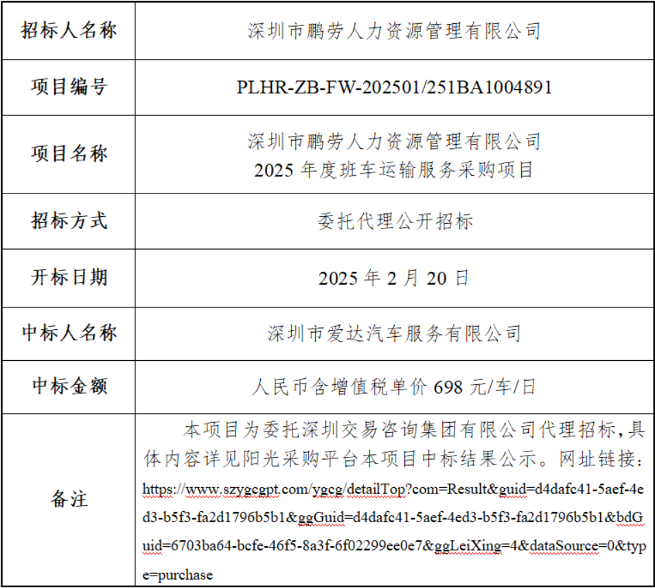 深圳市鹏劳人力资源管理有限公司2025年度班车运输服务采购项目中标结果公示