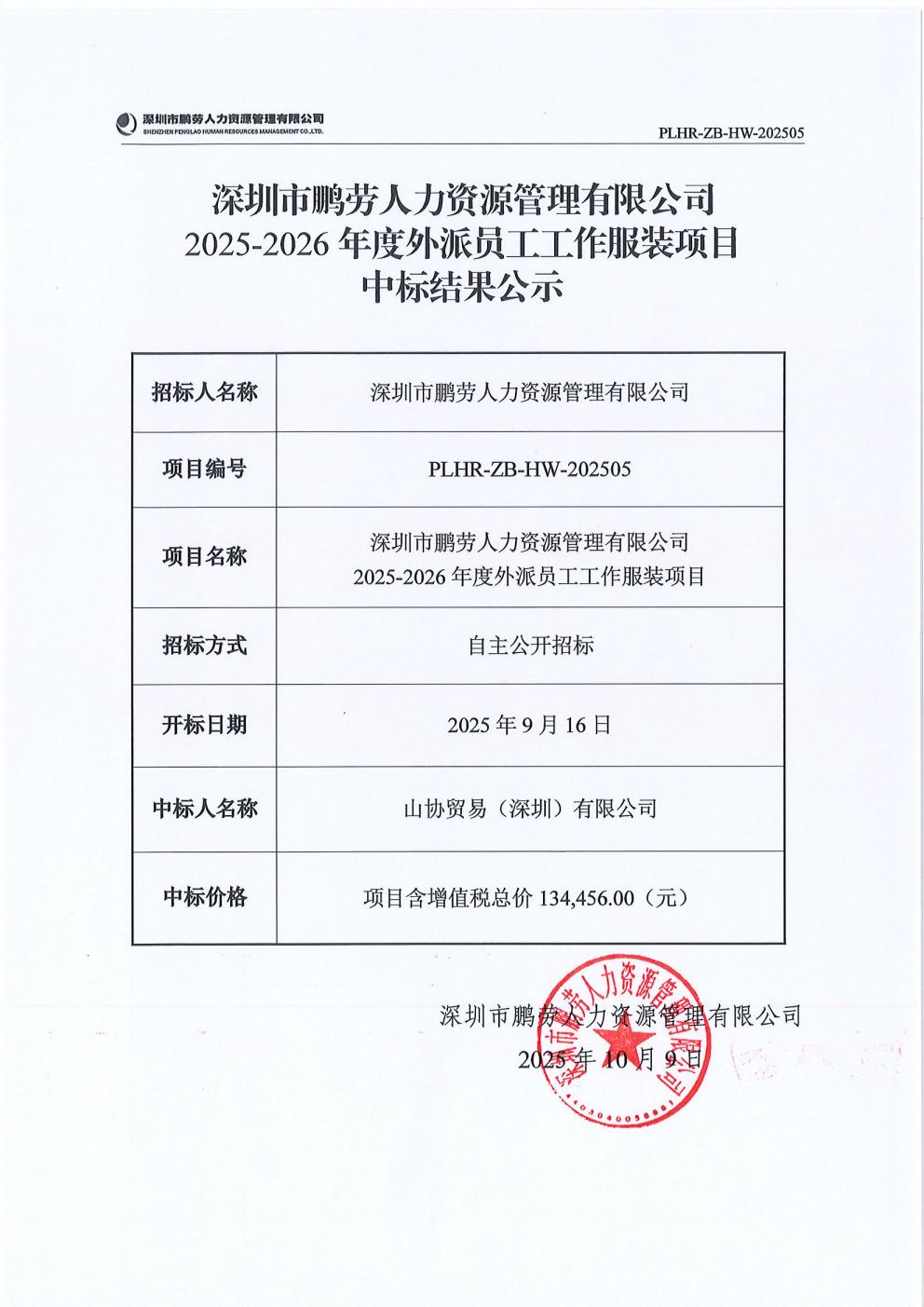 深圳市鹏劳人力资源管理有限公司2025-2026年度外派员工工作服装项目中标结果公示